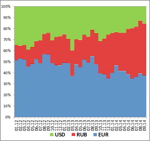 В валютной структуре чистого предложения иностранной валюты физических лиц наибольшая доля принадлежит российским рублям (46.4% по сравнению с 47.2% в августе 2014 года), затем евро (37.6% по сравнению с 39.3% в августе 2014 года) и долларам США (15.5% по сравнению с 12.6% в августе 2014 года).