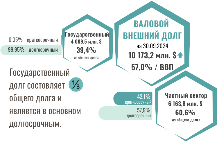 По предварительным данным, валовой внешний долг Республики Молдова увеличился на 0,5% по сравнению с концом 2023 года и на 30.09.2024 достиг 10 173,20 млн. долл. США, что составило 57,0% по отношению к ВВП (-4,2 п.п. в сравнении с 31.12.2023).