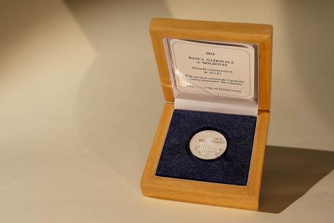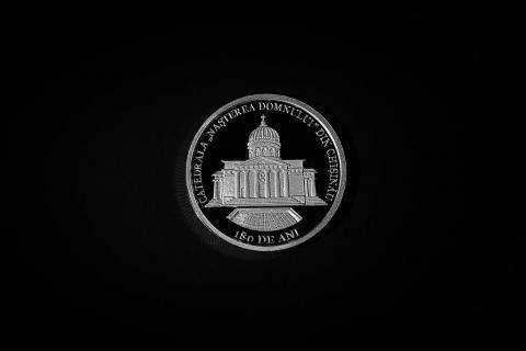 по окружности монеты заглавными буквами выгравирована надпись „180 DE ANI CATEDRALA „NAȘTEREA DOMNULUI” DIN CHIȘINĂU”.
