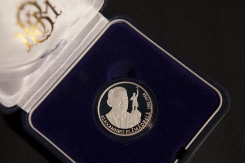 в нижней части, по окружности монеты, заглавными буквами выгравирована надпись „ALEXANDRU PLĂMĂDEALĂ” и годы жизни „1888 – 1940”.
