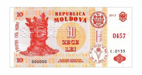 Лицевая сторона: Государственный герб Республики Молдова, надпись "REPUBLICA MOLDOVA", портрет Штефана чел Маре, многоцветный национальный орнамент, два вертикальных декоративных элемента, центральный гильош, номинальная стоимость в цифрах и буквах, художественно оформленная аббревиатура "BNM", факсимиле " GUVERNATOR, Д. Дрэгуцану", надпись по кругу "PE-UN PICIOR DE PLAI, PE-O GURĂ DE RAI...", стилизованное изображение литеры "V", год выпуска "2013", номер и серия банкноты, надпись "FALSIFICAREA ACESTOR BILETE SE PEDEPSEŞTE CONFORM LEGILOR"; |