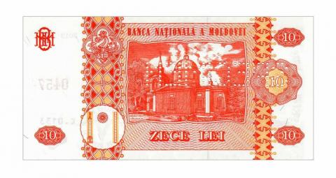 Оборотная сторона: Внутри рамы графическое изображение Монастыря Хыржаука и надпись "MĂNĂSTIREA HÎRJAUCA", номинальная стоимость в цифрах и буквах, два вертикальных декоративных элемента, герб Штефана чел Маре, стилизованное изображение колонны Трaяна, Колонны Бесконечности и между ними полумесяц, название эмиссионного банка "BANCA NAŢIONALĂ A MOLDOVEI", художественно оформленная аббревиатура "BNM". |