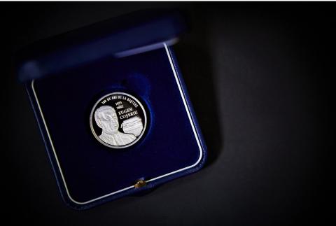 в верхней части, по окружности монеты заглавными буквами выгравирована надпись «100 DE ANI DE LA NAȘTERE».