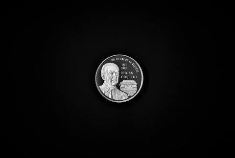 в центре – портрет Эуджена Кошериу, изображение пишущей машинки, надпись заглавными буквами «EUGEN COȘERIU» и годы жизни «1921-2002»;