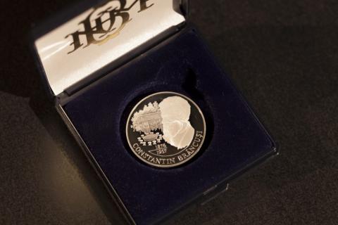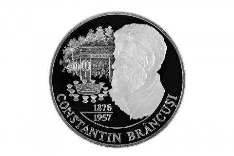 в нижней части, по окружности монеты – заглавными буквами выгравирована надпись "CONSTANTIN BRÂNCUŞI".