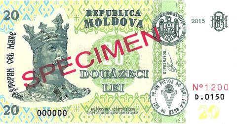 Модернизированная банкнота номинальной стоимостью 20 ЛЕЕВ, образца 2015 года, с факсимильной подписью президента Национального банка Молдовы - Октавиана Армашу.