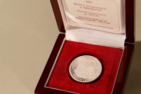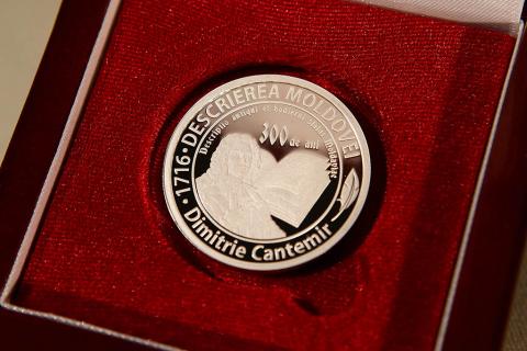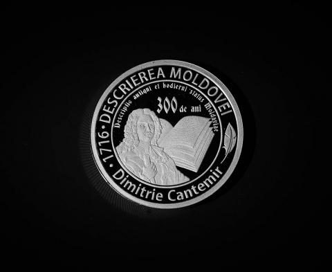 по окружности монеты выгравированы перо и надпись „1716•Dimitrie Cantemir• DESCRIEREA MOLDOVEI”.