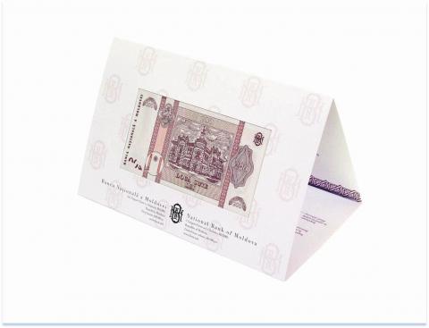 Оборотная сторона: Внутри рамы графическое изображение Примэрии муниципия Кишинэу, надпись "Primăria Municipiului Chişinău", номинальная стоимость в цифрах и буквах, три декоративных вертикальных элемента, герб Штефана чел Маре, стилизованное изображение Колонны Траяна, Колонны Бесконечности и между ними полумесяц, надпись "BANCA NAŢIONALĂ A MOLDOVEI", аббревиатура "BNM". |