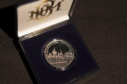 • în partea de sus,urmînd circumferinţa monedei - cu majuscule este gravată inscripţia "MĂNĂSTIREA CONDRIŢA".